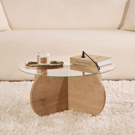 Aerio Clear Tempered Glass Coffee Table with Sapphire Oak Wooden Base
