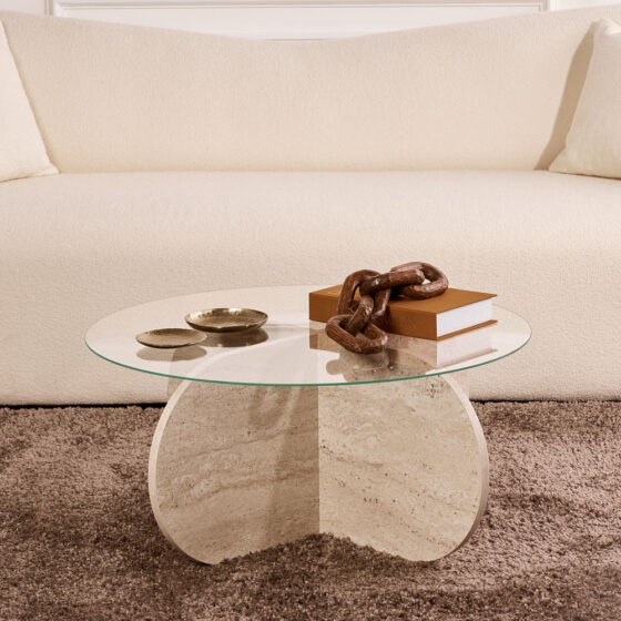 Aerio Clear Tempered Glass Coffee Table with Travertine Marble Effect